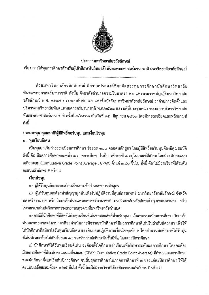 ด้วยมหาวิทยาลัยวลัยลักษณ์ มีความประสงค์ที่จะจัดสรรทุนการศึกษานักศึกษาวิทยาลัยทันตแพทยศาสตร์นานาชาติ ดังนั้น จึงอาศัยอำนาจความในมาตรา 24 แห่งพระราชบัญญัติมหาวิทยาลัยวลัยลักษณ์ พ.ศ. 2535 ประกอบกับข้อ 10 แห่งข้อบังคับมหาวิทยาลัยวลัยลักษณ์ ว่าด้วยการจัดตั้งและบริหารงานวิทยาลัยทันตแพทยศาสตร์นานาชาติ พ.ศ. 2561 และมติที่ประชุมคณะกรรมการบริหารวิทยาลัยทันตแพทยศาสตร์นานาชาติ ครั้งที่ 3/2563 เมื่อวันที่ 15 มิถุนายน 2563 โดยมีรายละเอียดและหลักเกณฑ์ดังนี้