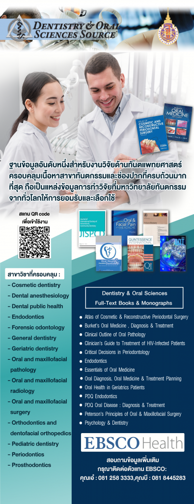 DENTISTRY & ORAL SCIENCES SOURCE Wajeenun Sitthirak 6 ปี ago วิทยาลัยทันตแพทยศาสตร์นานาชาตินำฐานข้อมูล DENTISTRY & ORAL SCIENCES SOURCE เป็นฐานข้อมูลสำหรับงานวิจัยด้านทันตแพทยศาสตร์ ครอบคลุมเนื้อหาสาขาทันตกรรมและช่องปากที่ครบถ้วน สำหรับนักศึกษา คณาจารย์วิทยาลัยทันตแพทยศาสตร์นานาชาติ